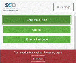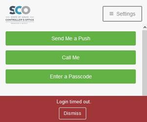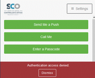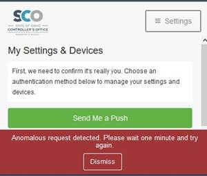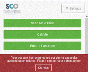 Select DISMISS, then contact the SCO ServiceDesk at servicedesk@sco.idaho.gov via your Authorized Primary or Alternate email address to request a DUO Account Unlock. Include your StateID in the email.
